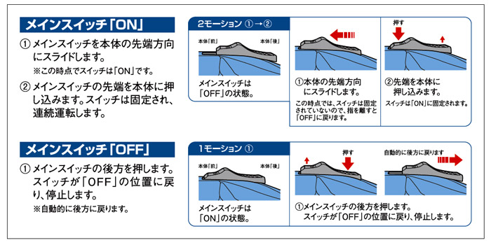 2モーションロックスイッチボディを握ったままその手で、ON⇔OFF操作が可能な手元スイッチを採用 |
