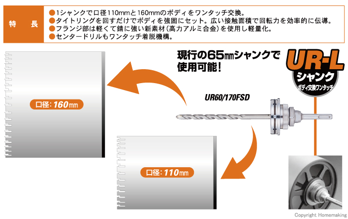 多機能コアドリルUR21 換気扇用コアドリル 振動用 SDSプラス軸(セット)110+160mm::UR21-KV1116SD