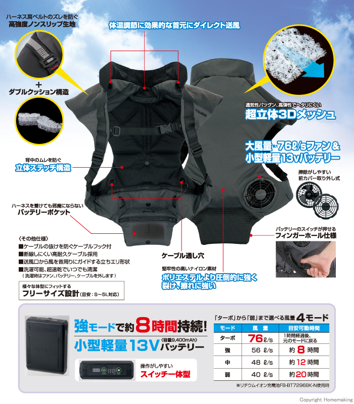 - 大風量最大76ℓ/sファン&小型軽量13vバッテリー