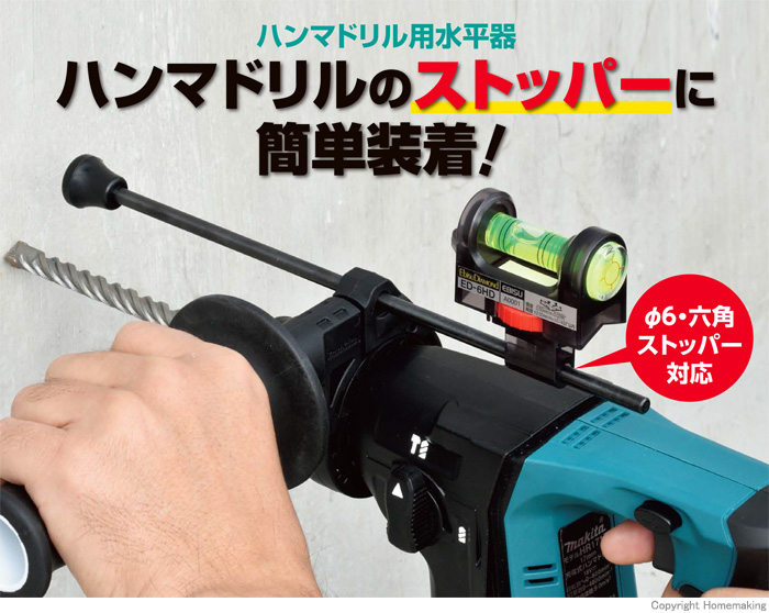 - 丸型気泡管で地面・天井に対し鉛直の確認と穴あけができます
