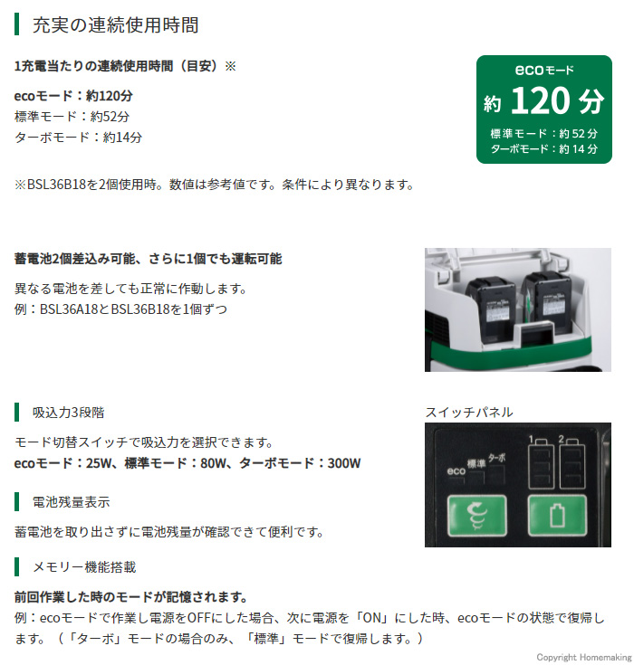 | 標準付属品 | RP3608DA(L)(2WPZ) マルチボルト蓄電池(BSL36B18X)×2個、急速充電器UC18YDL2(冷却機能付)、 ホース(内径⌀38×長さ1.5m)(一般清掃用)、ズームパイプ、 床用吸口、すきま用吸口、水用フィルタ、収納バッグ、ポリ袋×5枚 電池カバー×2個 |