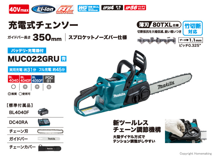 | 標準付属品 | MUC022GRU 40Vmaxリチウムイオンバッテリ(BL4040F)×1、充電器(DC40RA)、 チェーンカバー、レンチ13-16、丸型ヤスリ4、チェーンオイル |