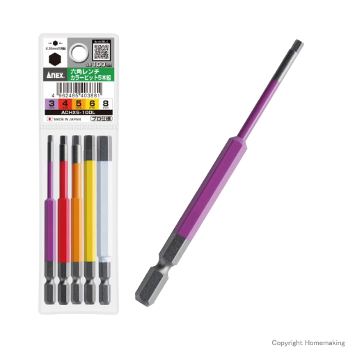 六角レンチカラービット5本組 全長100mm::ACHX-5100L