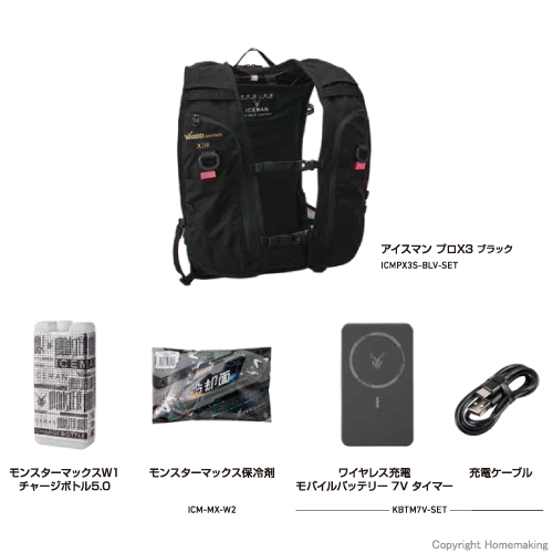 | 付属品 | バッテリー5,000mAh×1、モンスターマックス5.0(専用薄型ボトル1,000ml)×1、 モンスターマックス保冷剤×1、充電ケーブル×1、取扱説明書×1 ※スマホ供給用のケーブルは付属しません。 ※ACアダプターは付属していません。 |