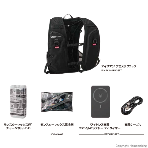 | 付属品 | バッテリー5,000mAh×1、モンスターマックス5.0(専用薄型ボトル1,000ml)×1、 モンスターマックス保冷剤×1、充電ケーブル×1、取扱説明書×1 ※スマホ供給用のケーブルは付属しません。 ※ACアダプターは付属していません。 |