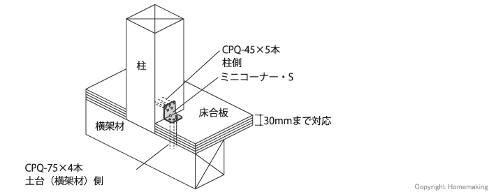 | 付属品 | 柱側専用ビス:CPQ-45(シルバー)×5本 土台(横架材)側専用ビス:CPQ-75(Mブルー)×4本 |